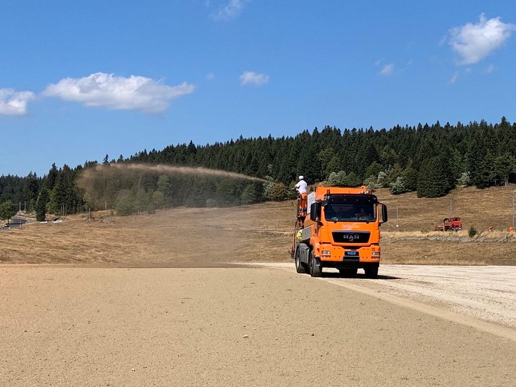 Zunächst erfolgt die eigentliche Saat im Anspritz-Verfahren. Als Zweites wird die Strohschicht aufgetragen, wobei die Strohhalme eine Länge von 10 – 15 cm aufweisen sollten. In einem dritten Arbeitsgang wird die lose Strohschicht mit dem rein natürlichen Ecoseed Haftstoff besprüht. Damit wird verhindert, dass das Stroh weggeweht wird.
